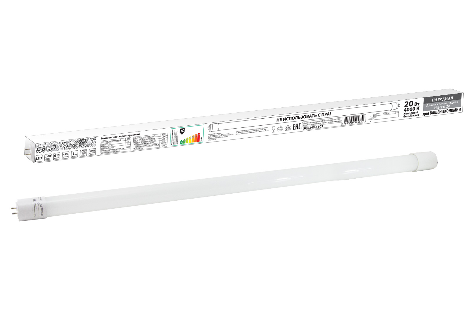 Лампа светодиодная НЛ-Т8-20 Вт-230 В-4000 К–G13 матовая, стекло НАРОДНАЯ TDM
